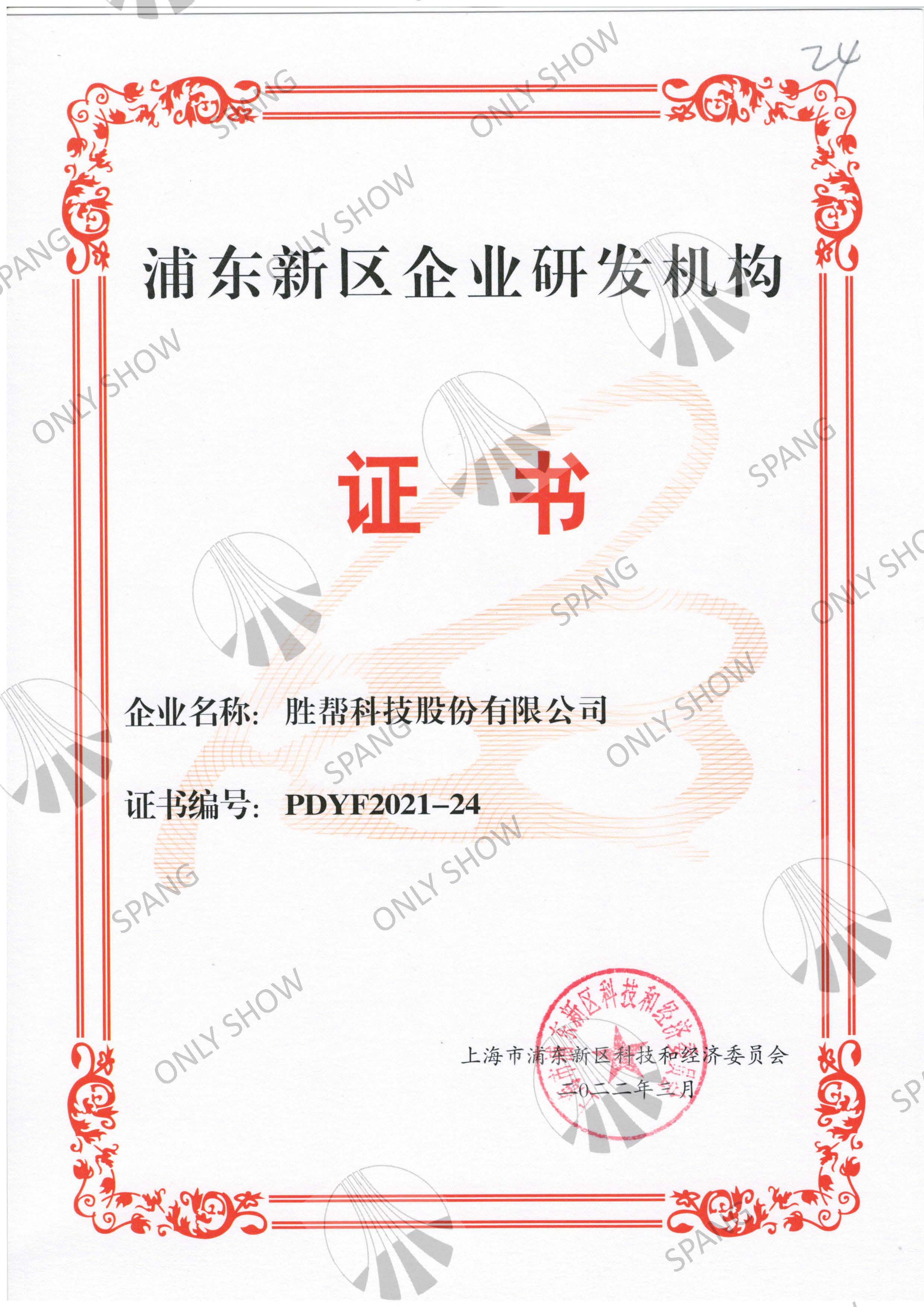 浦東新區(qū)企業(yè)研發(fā)機(jī)構(gòu)證書