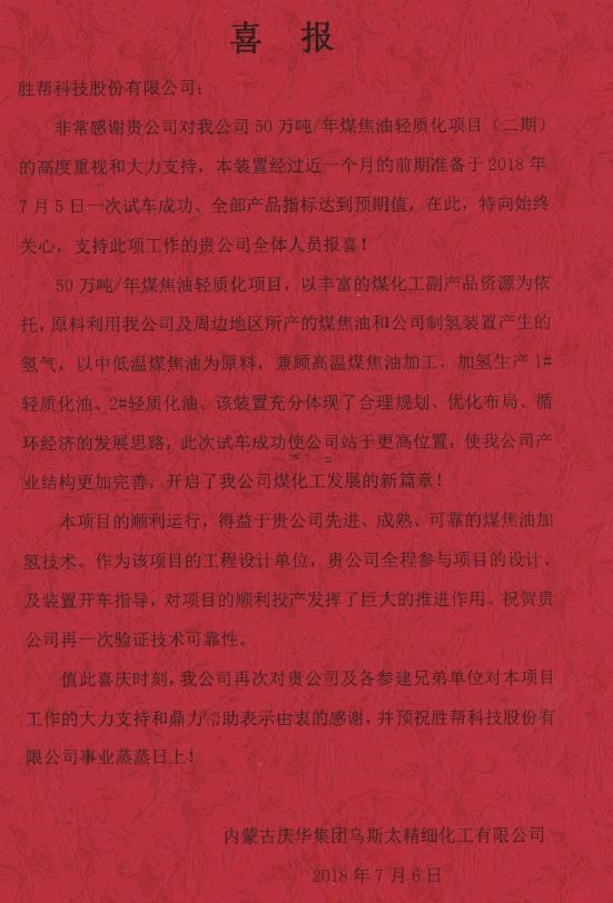 2018年7月5日,內蒙古慶華集團公司烏斯太精細化工有限公司50萬噸/年煤焦油加氫項目投料一次試車成功,順利生產出合格產品。該項目采用勝幫科技股份有限公司自主開發的煤焦油加氫技術,并且由勝幫公司承擔全部設計工作。項目投產后,將產出豐富的煤化工副產品資源,加以煤化公司及周邊地區所產的中低溫煤焦油為原料和公司制氫裝置產的氫氣,通過兩段加氫反應,可生產1#輕質煤焦油…