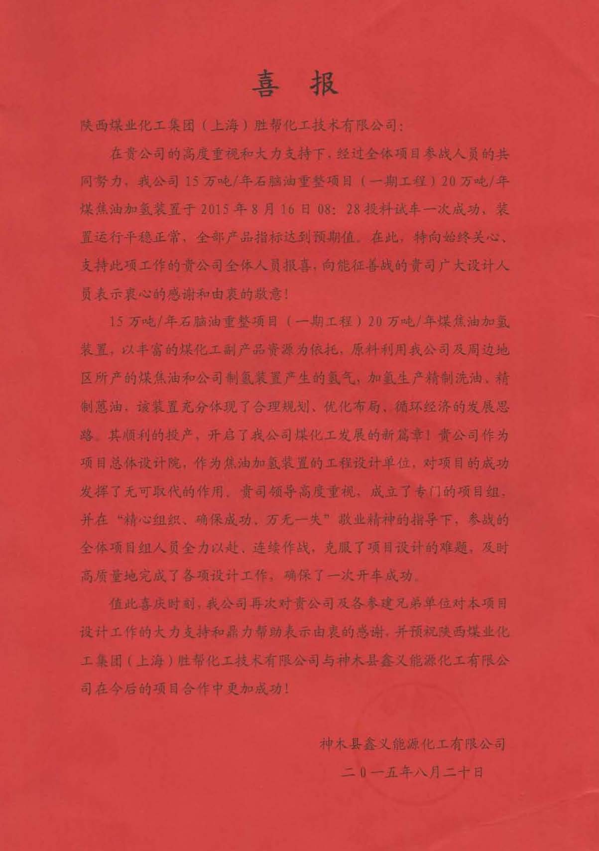 2015年8月,由陜西煤業化工集團(上海)勝幫化工技術有限公司承接的神木縣鑫義能源化工有限公司65萬噸/年煤焦油加氫綜合利用建設工程一期20萬噸/年煤焦油加氫裝置順利投產,是繼黑龍江寶泰隆、內蒙慶華之后,又一個投產項目。神木縣鑫義能源化工有限公司特向我公司發來喜報。 陜西煤業化工集團(上海)勝幫化工技術有限公司為該項目總體設計院,作為焦油加氫裝置的工程設計單位…