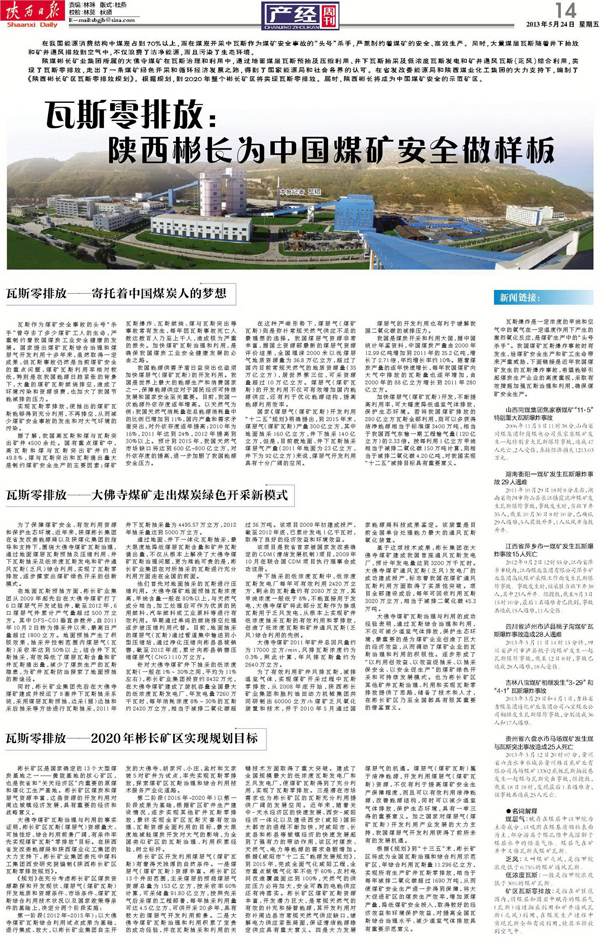 瓦斯零排放:陜西彬長為中國煤礦安全做樣板陜西日報:2013年5月24日第14版 鏈接地址:http://esb.sxdaily.com.cn/shtml/sxrb/20130524/v14.shtml瓦斯零排放:陜西彬長為中國煤礦安全做樣板在我國能源消費結構中煤炭占到70%以上,而在煤炭開采中瓦斯作為煤礦安全事故的“頭號”殺手,嚴重制約著煤礦的安全、高效生產。同時,大量煤層瓦斯隨著井下抽放和礦井通風排放到空氣中,不…