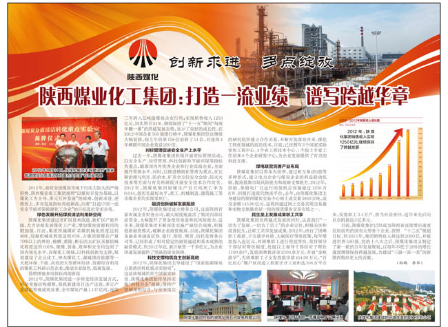 經(jīng)濟(jì)日?qǐng)?bào)2013年3月9日第8版 創(chuàng)新求進(jìn) 多點(diǎn)綻放陜西煤業(yè)化工集團(tuán)打造一流業(yè)績(jī) 譜寫(xiě)跨越華章 2012年,面對(duì)全國(guó)煤炭市場(chǎng)下行壓力加大的嚴(yán)峻形勢(shì),陜西煤業(yè)化工集團(tuán)按照“以煤炭開(kāi)發(fā)為基礎(chǔ),以煤化工為主導(dǎo),多元互補(bǔ)發(fā)展”的戰(zhàn)略,創(chuàng)新求進(jìn),逆勢(shì)而上,多項(xiàng)發(fā)展指再創(chuàng)新高,向著“打造中國(guó)一流安全節(jié)能環(huán)保能源化工企業(yè)”的目標(biāo)邁出堅(jiān)實(shí)步伐。綠色發(fā)展開(kāi)拓煤炭清潔利用新空間 …