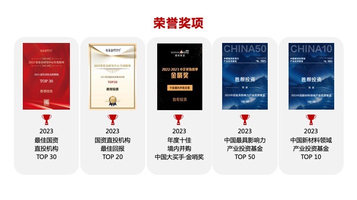 公司開通運營了“勝幫投資”公眾號,累計發布研究報告及新聞報道20余篇,拓展了主動對外發聲渠道。同時,公司積極參與私募股權行業評選,成功榮獲了母基金研究中心、36氪創投研究院、晨哨集團等專業平臺頒發的“2023中國新材料領域產業投資基金TOP10 ”、“2023中國最具影響力產業投資基金TOP50”、“2023國資直投機構最佳回報TOP20”等五個投資領域的專業獎項,公司品牌知名度得到進一步提升。
