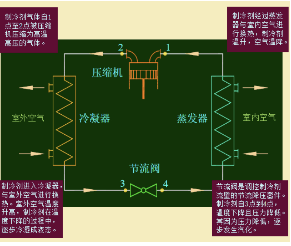 空調由四大部件組成,有蒸發器、壓縮機、冷凝器、節流閥(或膨脹閥)。還有一個重要的介質便是制冷劑。夏季,室內空氣通過進風口進入機組內,蒸發器中的制冷劑吸收室內空氣的熱量,制冷劑由低溫低壓的氣液混合物(氣體多、液體少)變為中溫低壓的氣體,之后經過壓縮機壓縮為高溫高壓的氣體,再在冷凝器側放熱變為中溫高壓的氣液混合物(氣體少、液體多),后由節流閥減壓為低溫低壓的氣液混合物(氣體多、液體少),又回到蒸發器,循環往復。在蒸發器側被降溫后的空氣重新送入房間,冷凝器側放出的熱量在風機的動力下被室外空氣帶走。原理見下圖1。