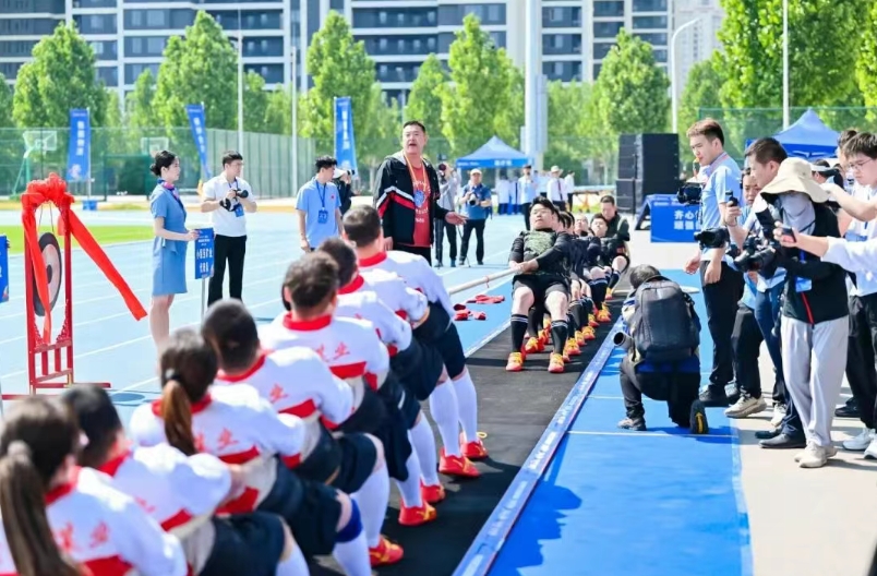拔河賽:鳴鑼比拼 斗志昂揚拔河賽場,王永崗為拔河項目鳴鑼開賽,各代表隊緊握繩索、下沉發力,在吶喊聲中展開力量與協作的對決。