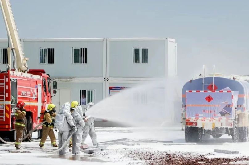 本次演練創(chuàng)新采用虛實結(jié)合、科技應用與第一視角模式,模擬腳手架坍塌、柴油罐車起火、丙烯球罐泄漏等多起事故,檢驗榆林化學與建設(shè)集團多類型事故并發(fā)處置能力。事故模擬發(fā)生后,兩家單位迅速啟動應急預案,充分發(fā)揮高科技設(shè)備與技術(shù)應用優(yōu)勢,精準定位7名被困人員位置,聯(lián)動陜煤集團專業(yè)救援力量開展緊急救援。演練歷時一個半小時,成功解救并疏散“被困人員”,高效完成各項任務。