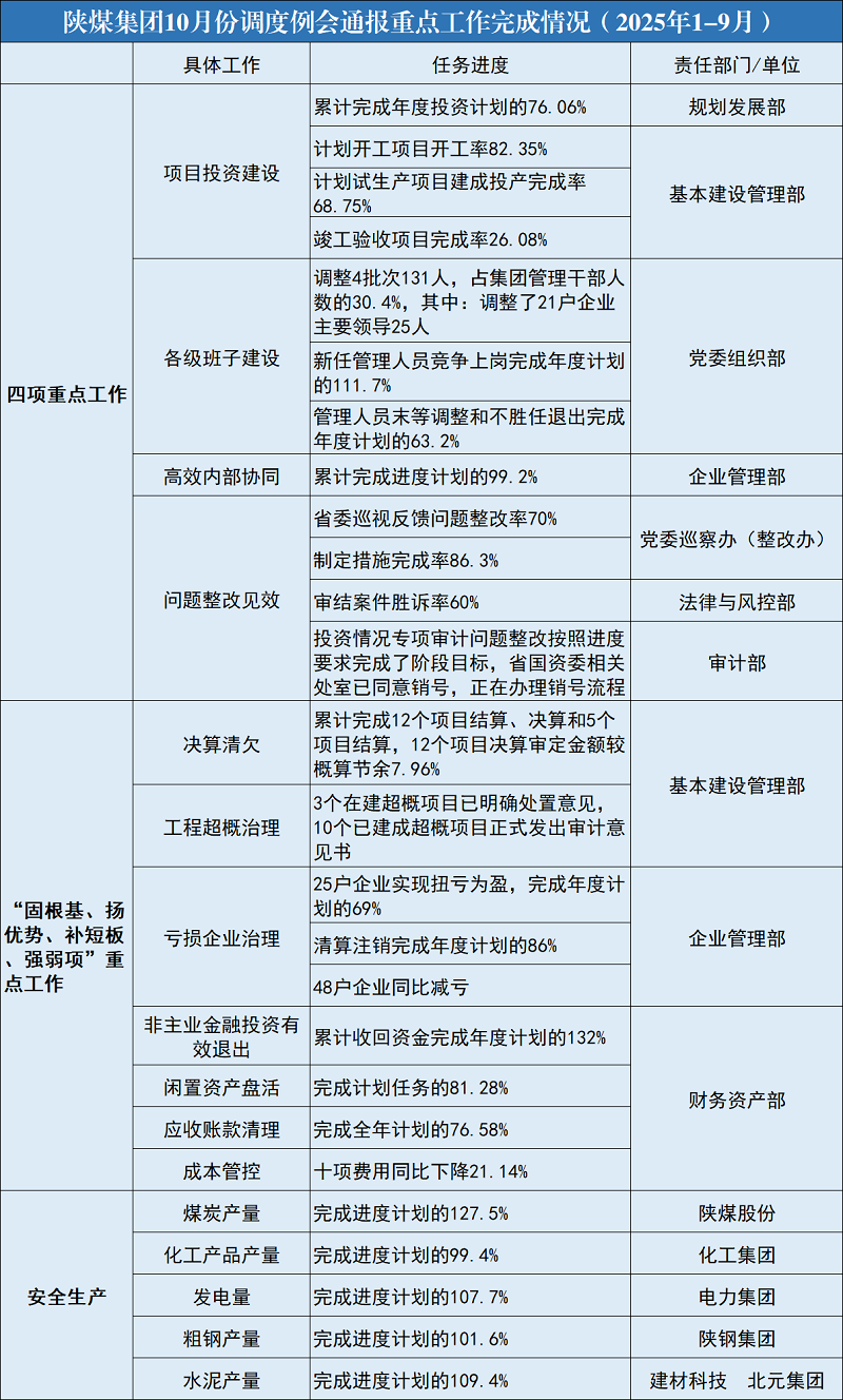 會議總結9月份重點任務完成情況,分析當前工作存在的問題和不足,安排10月份重點工作;相關職能部門分別匯報了項目投資建設,高效協同發展,各級領導班子建設,巡視巡察、內部審計、涉訴案件問題整改及安全環保、生產經營、閑置資產盤活、虧損企業治理等重點工作推進情況。張文琪逐一對各部門工作進展進行點評,肯定成績、指出問題,并對下階段工作提出明確要求。