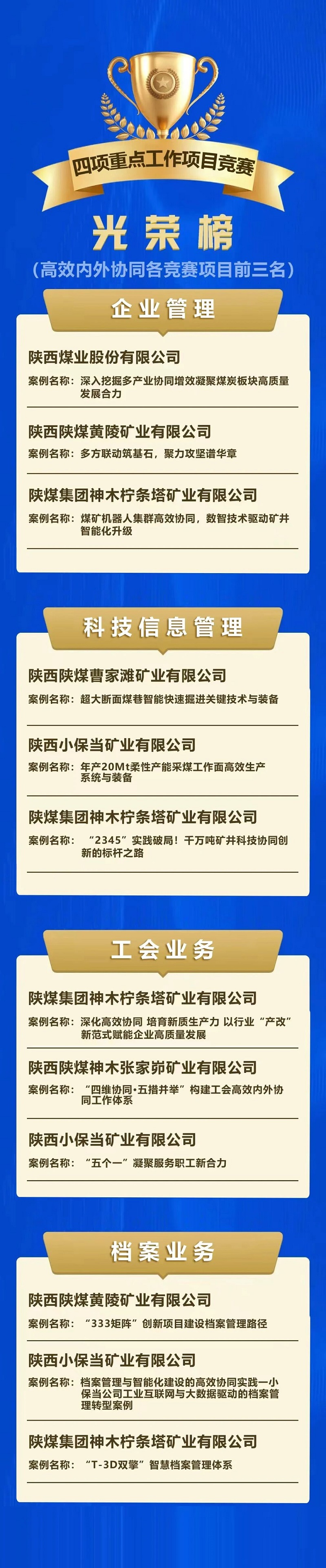 10月23日至24日,陜煤集團在曹家灘礦業公司舉辦高效內外協同業務競賽。62支參賽隊伍在企業管理、科技信息管理、工會業務、檔案業務4個賽項中激烈角逐,最終評選出金銀銅獎和金牌案例主創。集團公司黨委委員、工會主席、職工董事李向東及賽項部門負責人分別為各賽項獲獎單位和個人頒獎。