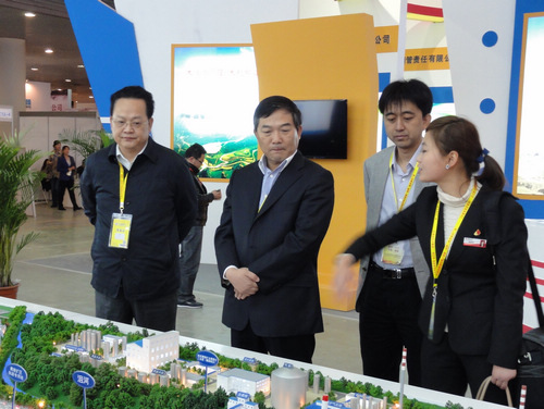 集團公司總經理楊照乾、黨委副書記馬富元在集團展區內聽取工作人員講解黃陵循環經濟發展情況
