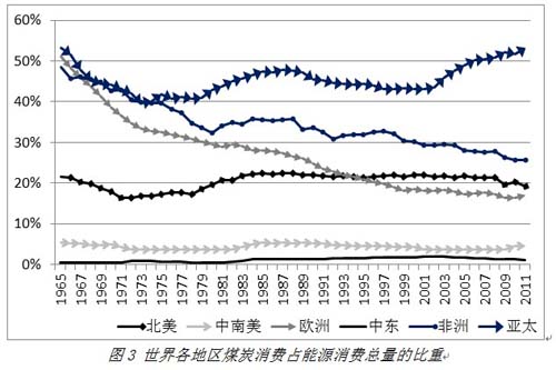 全球對煤炭的消費量在不同地區表現各異。歐洲煤炭消費在1979年達到頂峰,北美煤炭消費在2005年達到頂峰(兩地區占世界煤炭消費總量的27.7%)。其他地區煤炭消費尚未飽和,亞太地區煤炭消費增長十分迅猛。